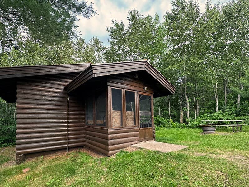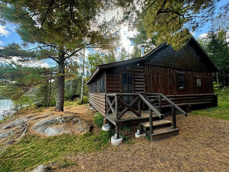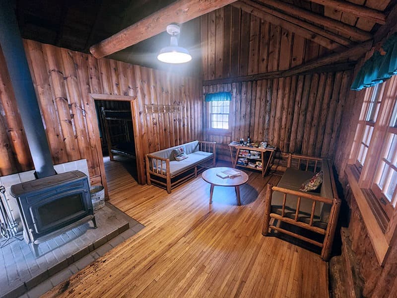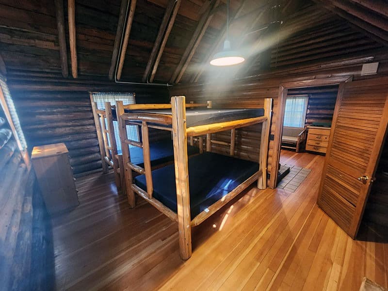 Cabin B • Accommodates: Up to eight people. • Three-room log cabin, located about ten feet from the shores of Mic Mac Lake. • Two bedrooms with two full-over-full bunks. • Large screened-in porch overlooks the lake and the hills of the park.