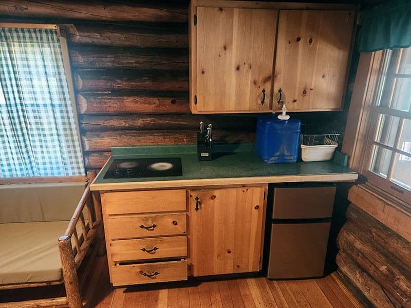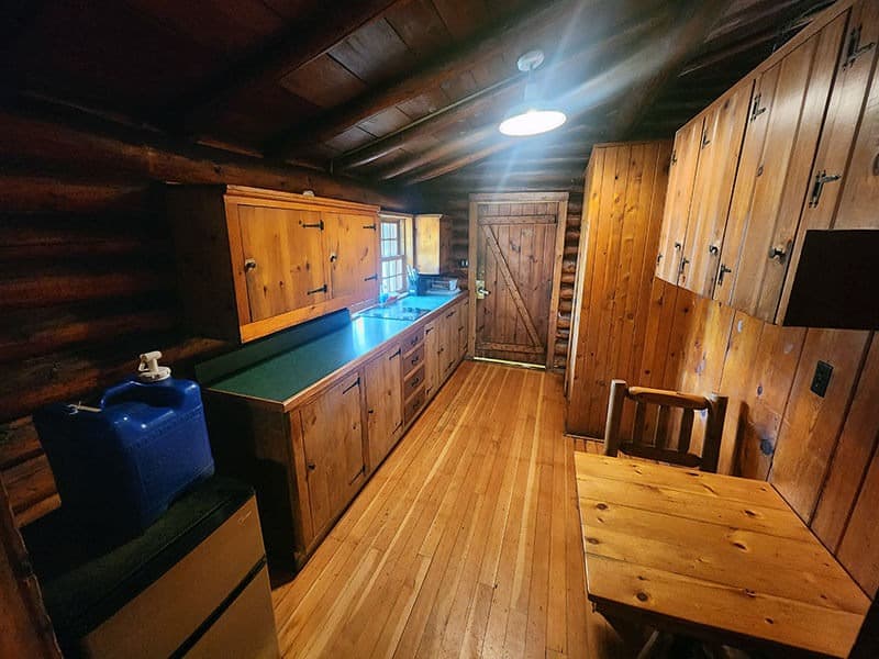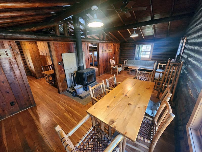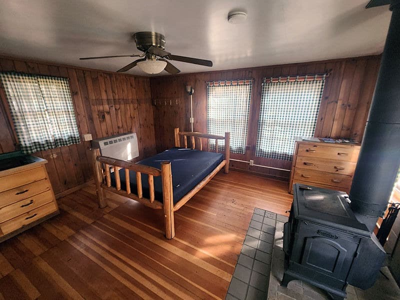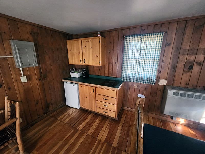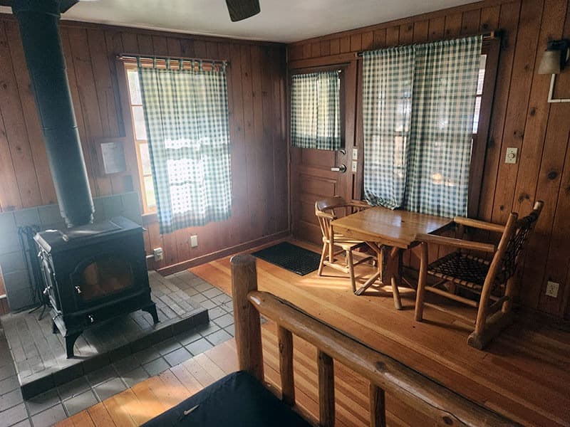 All four cabins include a electric heat and a woodstove and firewood; a small kitchenette with two-burner cooktop, mini refrigerator, pots, pans, plates, and utensils; a picnic table and fire ring with grill; a screened porch; and use of a canoe with paddles and life vests.