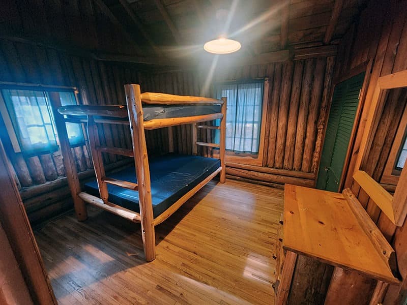 Cabin A • Accommodates: Up to six people. • Two-room cabin with a view of Mic Mac Lake from the large screened-in porch. • One bedroom with two twin-over-full bunks.