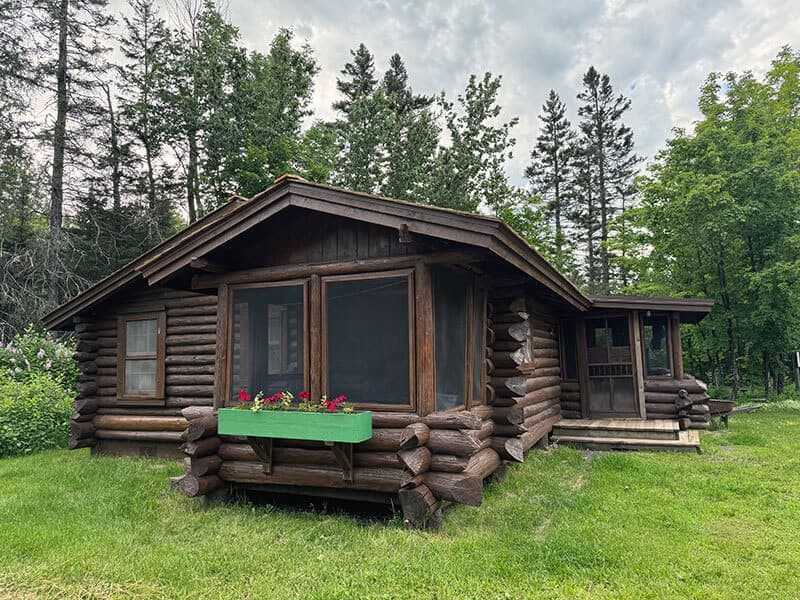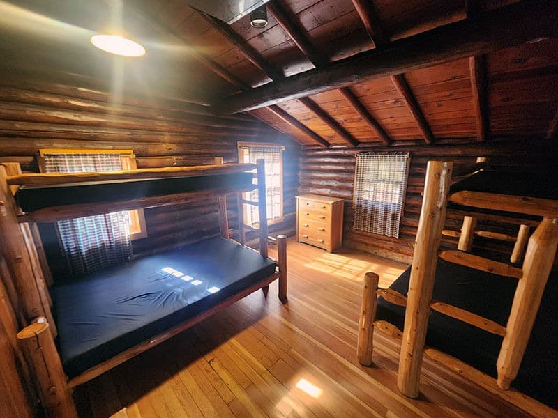 Cabin C • Accommodates: Up to six people. • Three-room log cabin nestled on the edge of the woods near the lodge and shower building. • One bedroom with two twin-over-full bunks. • Two small screen porches with a view of Mic Mac Lake.