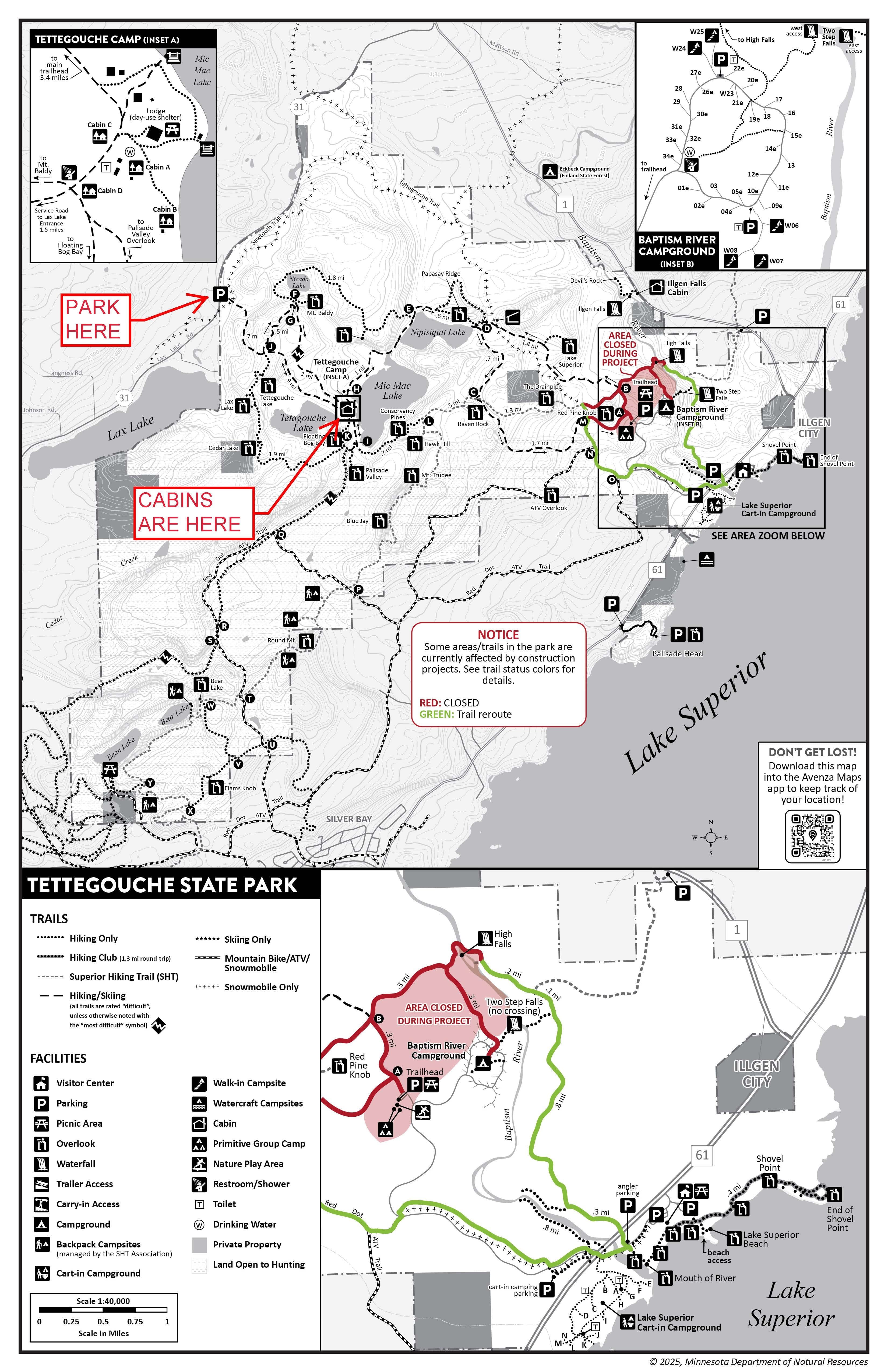 The cabins we have reserved are at Tettegouche Camp, which is located in the interior of the 9,000 acre Tettegouche State Park. It is a 1.6-mile hike from the Lax Lake Road access (see map below). Mountain bikes are allowed. You must carry in your gear; carts are not provided. Four rustic cabins are clustered together, and share a shower/bathroom building and a one-room day-use lodge with several picnic tables and benches, two fireplaces, and a large screened porch facing Mic Mac Lake.